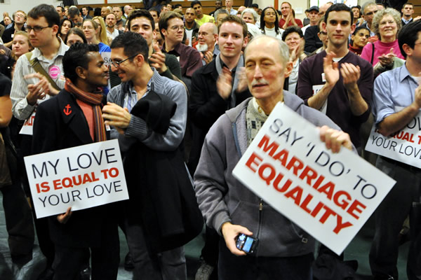 Tuesday’s vote triggered a burst of applause from dozens of LGBT activists and same-sex couples who packed the Council chambers to watch the debate and final roll-call vote on the Religious Freedom & Civil Marriage Equality Amendment Act of 2009.