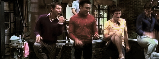 A scene from the groundbreaking gay movie 'Boys in the Band.' Dancing to Martha and the Vandellas from left are Kenneth Nelson as Michael, Reuben Greene as Bernard, Cliff Gorman as Emory and Keith Prentice as Larry. In the background is Frederick Combs as Donald. (Photo courtesy of Silverdocs)