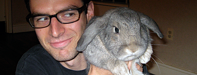 Actor Daniel Eichner takes some tips from a real rabbit (Monster) for the upcoming Capital Fringe Production of ‘HORRIBLE CHILD’ in which Eichner plays a gay bunny. ‘HORRIBLE CHILD’ is staged by gay director Jose Carrasquillo. Eichner is straight (Photo courtesy of Eichner)