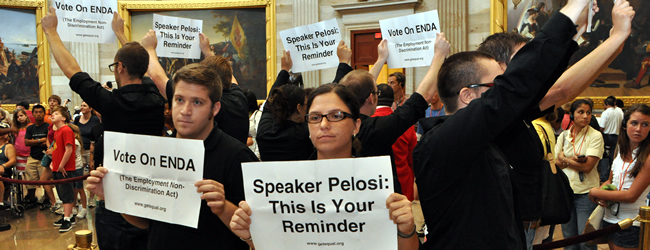 Prior to the action, demonstrators had been participating in a tour of the U.S. Capitol. When the tour reached the Rotunda, protesters broke away and formed a group in the center of the room while holding up signs reading “Vote on ENDA” and “Speaker Pelosi: This is Your Reminder.”