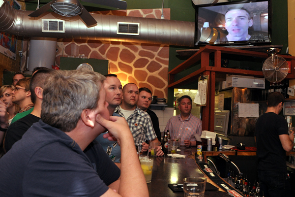 Attendees listen to gay sex columnist Dan Savage give a satellite speech at Duplex Diner for the Trevor Project. (Blade photo by Michael Key)