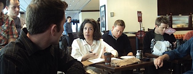 Lynne Brown addresses Blade staffers in a coffee shop in downtown Washington the day after Window Media closed the paper last November. (Blade file photo by Joey DiGuglielmo)