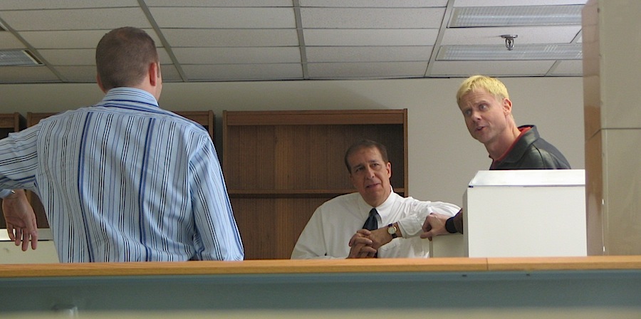 Chris Crain, right, chats with Kevin Naff, left, and Lou Chibbaro in the Blade newsroom in 2009. Crain was no longer associated with the paper at the time but came to see the then-new offices at the National Press Club. (Blade file photo by Joey DiGuglielmo)