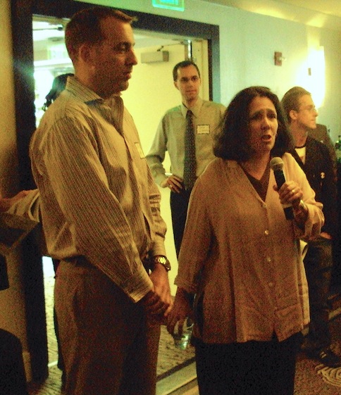 Blade publisher Lynne Brown, with mic, speaks at a Blade re-launch party in April. Co-owner and editor Kevin Naff is at left. The paper had continued publishing since it was shuttered last November but used the name DC Agenda for a few months. (Blade file photo)