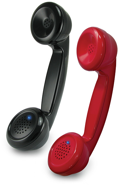 Thinkgeek.com’s Retro Phone Handset ($29.99) connects to most cell phones via a 2.5mm jack, but not some newer Blackberry models, RAZR or Nokia phones and no batteries required. You can also get the Bluetooth Retro Handset which works with Bluetooth V1.0, 1.1 and 1.2 with a USB charged battery ($29.99).