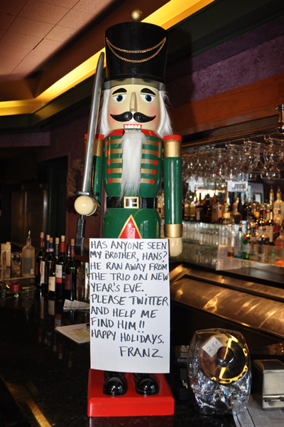 This nutcracker figurine at Trio Restaurant (at 17th and Q streets, N.W.) had a twin that was stolen on New Year’s Eve. Trio owner George Mallios says the nutcrackers — which are about four feet tall and stood guard at the cash register during the holidays — have been part of the restaurant’s Christmas display for “about the last 10 or 15 years” and he would love to recover the missing statuette.