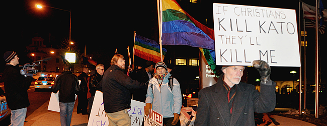 Clad in heavy coats and carrying harm-warmers as they braved the February cold, protesters waived Pride flags and held up signs reading “If Christians Kill Kato, They’ll Kill Me” and “David Kato: Brutally Loved to Death by Christian Missionaries.”
