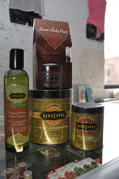 Kama Sutra makes this line of body products in a variety of textures and tastes. The Lover’s Body Paint is chocolate flavored and retails for $29.95. Body Oil is $22.95. Honey Dust — made to be applied, then licked off, is $28.95 for a large jar. Smaller containers, available in honey and strawberry flavors, are $19.95.
