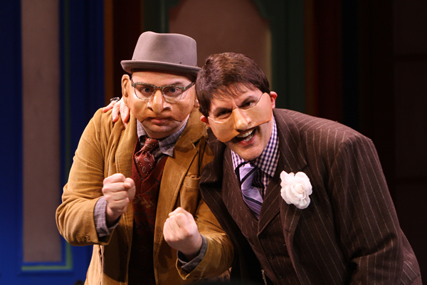 The production’s superb design includes Tony Cisek’s fun house-colored, many-doored set, and Kate Turner-Walker’s hip, Edwardian-ish costumes. Aaron Cromie has designed terrific theatrical masks that exaggerate the male characters’ noses, cheeks and ears. Each set of twins wears matching masks. With bald heads and outsized glasses and noses, the Dromios (who admirably pull off the lion’s share of the show’s physical comedy) are dead ringers for “Mr. Six,” the frenetic, dancing man from the Six Flags TV ads. When these identical servants finally meet face to face, one says to the other “I see by you I am a sweet-faced youth.” Hilarious.
