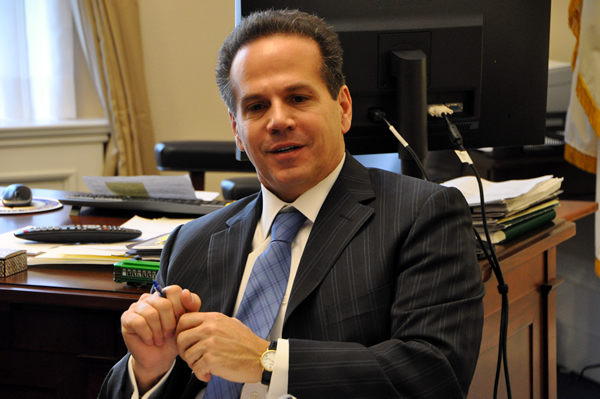 After his constituents leave his office, Cicilline removes his jacket and retires behind his desk as he prepares for his interview with this reporter.