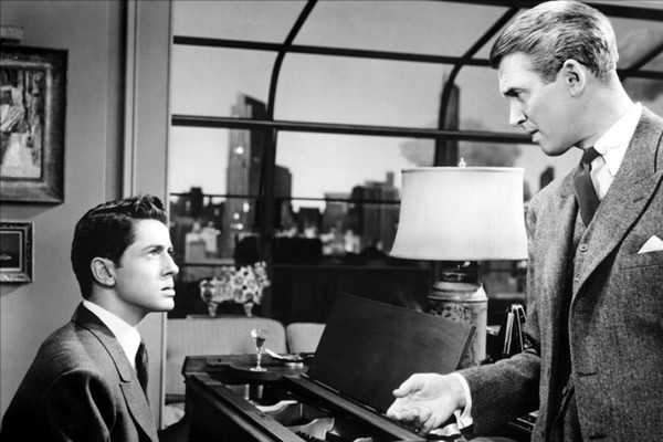 Farley Granger (left) plays a gay pianist opposite James Stewart in Alfred Hitchcock's 'Rope.' Granger, who was bi, died this week in New York. (Photo courtesy of Universal/MCA)
