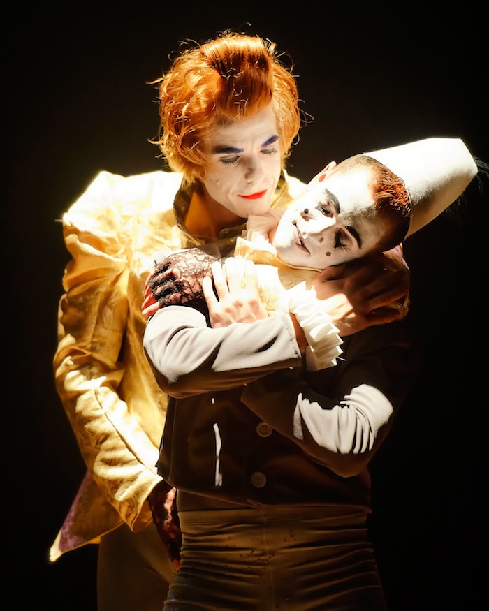 Now and then, Synetic takes liberties with its source materials. In this adaptation, Lear’s only honest daughter Cordelia is replaced by a good gay son — Cordelio (perfectly played by Chris Dinolfo in a tiny dunce cap and tight pants). After his sisters spy him in a hot clinch with his boyfriend, they out their brother (by painting his lips bright red and making him wear women’s rhinestone earrings) in front of the king. Lear reacts badly, disinheriting and banishing his only son. Eventually Cordelio reunites with his father, but in typical old school fashion the gay character bites the dust, not by his own hand but swinging from a noose nonetheless.
