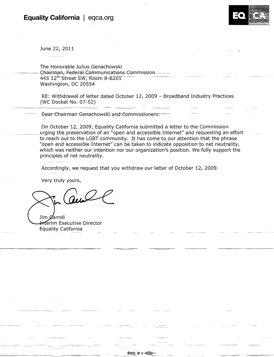 Interim Executive Director Jim Carroll officially retracts Equality California’s October 2009 letter to the FCC that seemed to support an anit-net neutrality stance.