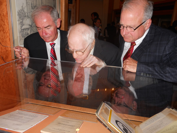 Frank Kameny (center) at the Library of Congress’ ‘Creating the United States’ exhibit looking at his 1961 Supreme Court brief flanked by historian John Haynes (left) and Charles Francis. (Photo by Charles Francis)