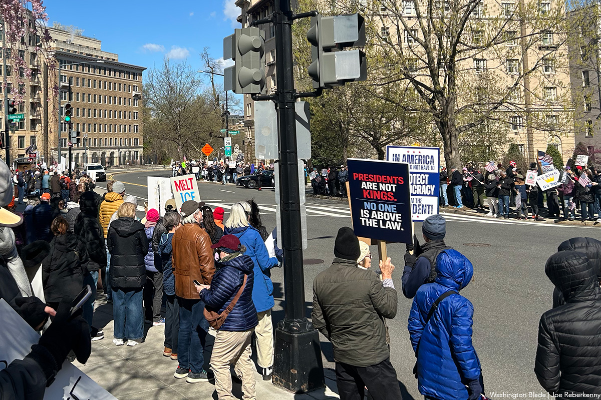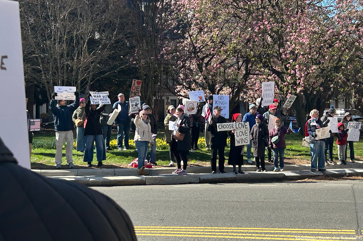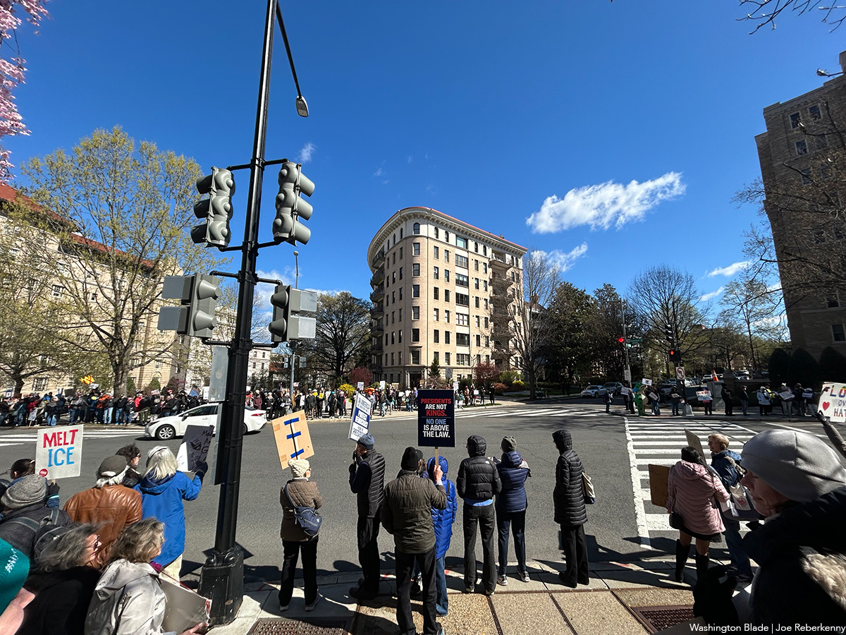By 10 a.m., the Washington Blade estimated around 200 people had braved bitter winds and temperatures hovering around 40 degrees, with bright sun, to stand along the cherry blossom-adorned streets of Kalorama and Connecticut Avenue. Protesters carried signs large and small, from professional printed banners criticizing Trump’s disregard for the “everyman” to handmade signs emphasizing love, calling for the melting of ICE, and addressing issue-specific concerns like ending the wars in Gaza and Iran — both policies propagated by President Donald Trump.