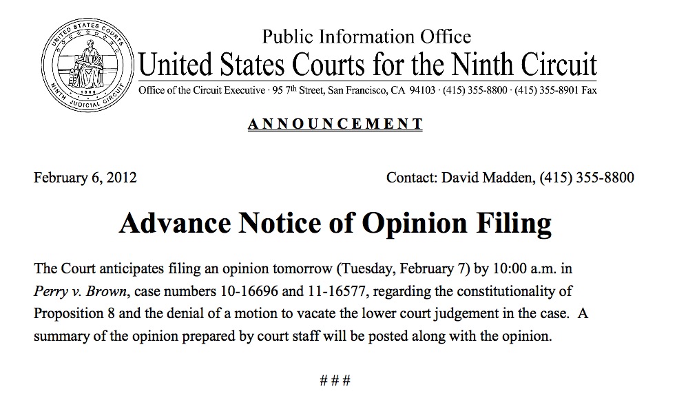 The U.S. Ninth Circuit Court of Appeals is set to issue a ruling on Tuesday by 10 am Pacific Time on the constitutionality of California’s Proposition 8, according to the court website.