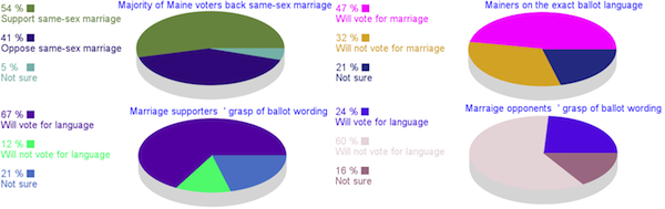 - As seen above, ThinkProgress alerts us to a new PPP poll that says Maine voters are cool with extending marriage rights to same-sex couples… but aren’t really sure about the ballot language that’s been chosen to do so. That’s why its very important that the gays in Maine start making commercials that just say “Yes!”