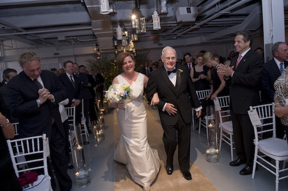 New York City Council Speaker Christine Quinn's father, Lawrence Quinn, escorts her down the aisle as New York Gov. Andrew Cuomo and other dignitaries watch. (Photo by William Alatriste)