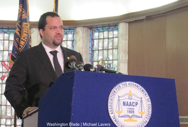 NAACP President Benjamin Todd Jealous speaks at his organization's national headquarters in Baltimore on Monday. (Washington Blade photo by Michael K. Lavers)
