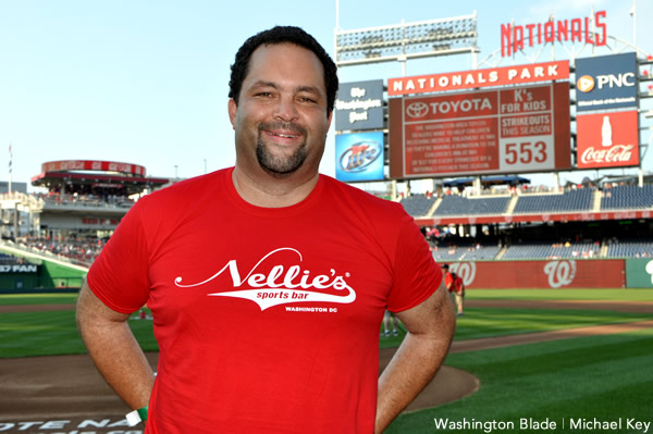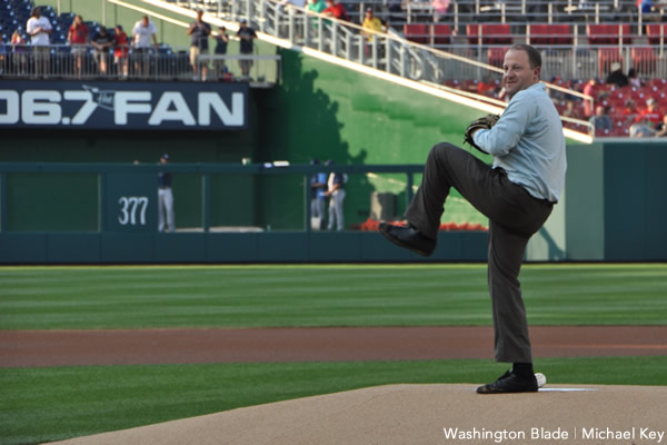 Also participating in the pre-game ceremony was D.C. Police Sgt. Brett Parson, former commander of the department’s Gay & Lesbian Liaison Unit, who’s gay. Parson was given the task of declaring from the field “Play Ball!” the traditional kick off for a game.
