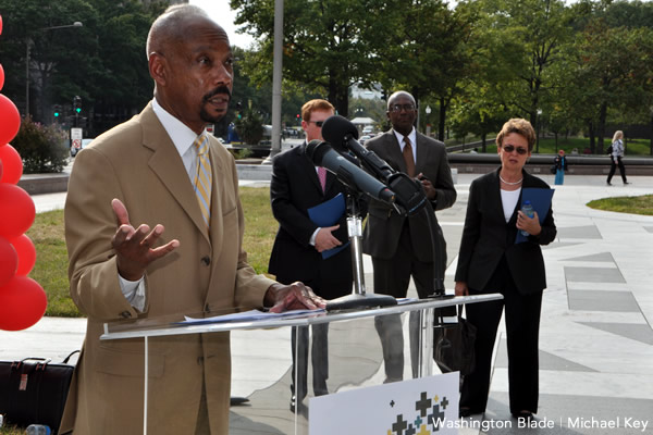 Doctor Gregory Pappas of the DOH’s HIV/AIDS, Hepatitis, Sexually Transmitted Disease and Tuberculosis Administration joined Jeffrey Richardson, director of the Mayor’s Office of GLBT Affairs; Venton Jones of the National Black Gay Men’s Advocacy Coalition; David Mariner, executive director of the D.C. Center for the LGBT Community and other HIV/AIDS service providers and activists at the press conference.