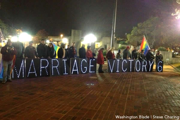 More than 25 people backed by large rainbow flags braved the chill and dampness as well as a massive water main break in Midtown to gather at McKeldin Square at the Inner Harbor. The diverse crowd held up lit panels spelling out “MARRIAGE VICTORY 6” denoting the victory on Question 6 on Election Day. Del. Mary Washington and GLCCB Board President Bud Beehler were among the celebrants.