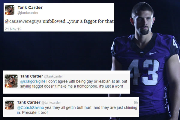 Rookie Tank Carder was unapologetic for calling a follower a “faggot,” later tweeting “I don’t agree with being gay or lesbian at all…” according to gay sports site OutSports, prompting rebukes from across the web, his team and a gay former fellow-TCU football star.