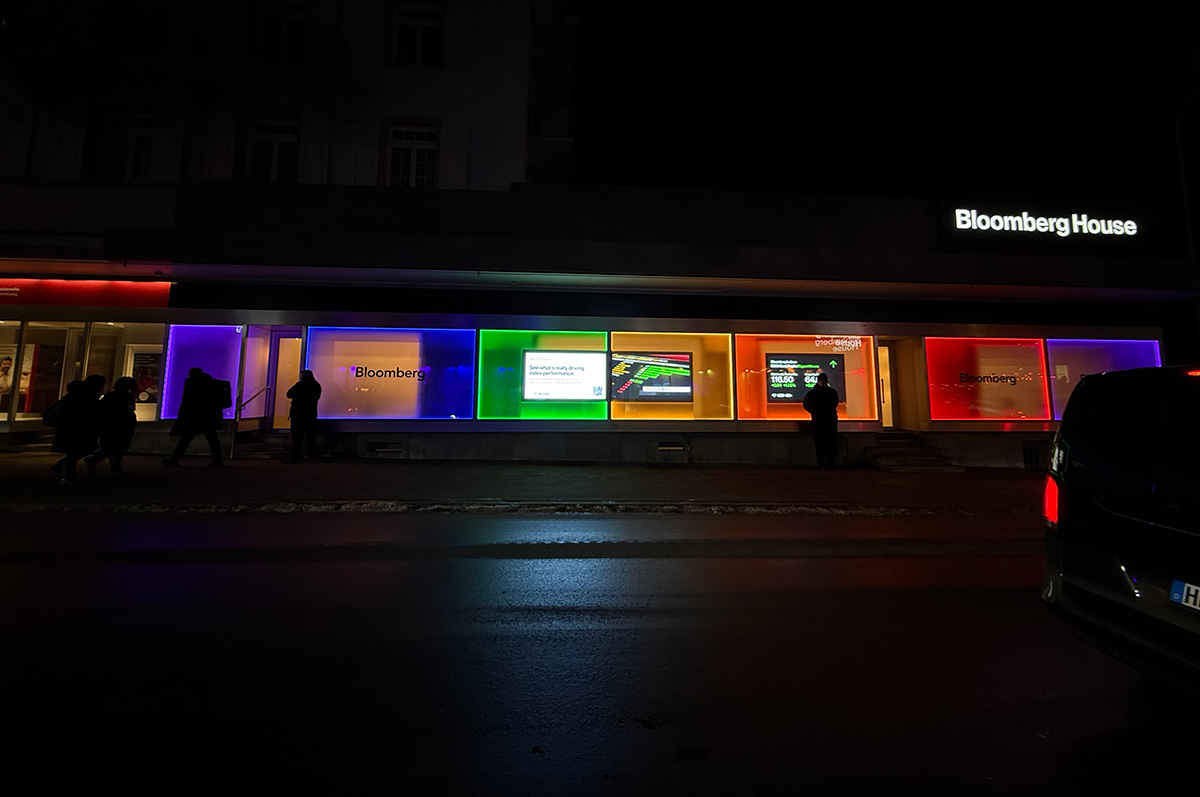 A dozen companies that are participating in the World Economic Forum on Wednesday lit up their venues on the Davos promenade in rainbow colors.