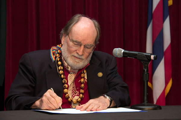 Hawaii Gov. Neil Abercrombie on Nov. 13, 2013, signs his state’s same-sex marriage bill into law. (Photo courtesy of State of Hawaii/Office of the Governor)
