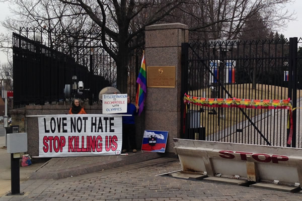 Activists in New York, Philadelphia and nearly 40 other cities around the world held similar events during the opening ceremony. A handful of activists gathered outside the Russian embassy in Northwest D.C. on Feb. 9 to protest the Kremlin’s gay rights record.