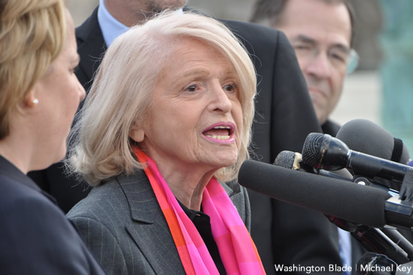 Edith Windsor speaks outside of the U.S. Supreme Court on March 26, 2013, following oral arguments in her case that challenged the Defense of Marriage Act. (Washington Blade file photo by Michael Key)