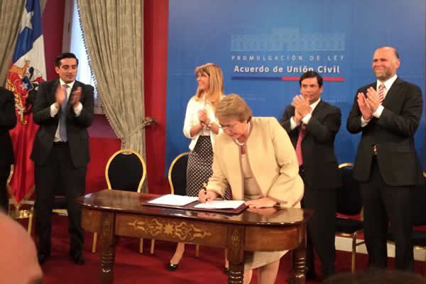 Chilean President Michelle Bachelet earlier this month signed a law that will allow gays and lesbians in her South American country to enter into civil unions. Her Socialist government in February announced that it would no longer oppose marriage rights for same-sex couples in the Inter-American Court of Human Rights case.