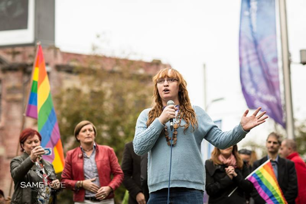 Kate Doak, a transgender journalist, speaks at a same-sex marriage rally in Sydney in May. (Photo courtesy of Australian Marriage Equality)