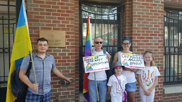 LGBT rights advocates gathered outside the Ukrainian Embassy in D.C. on Aug. 14, 2015, to protest a court ruling that banned a Pride march in the city of Odessa. (Photo courtesy of Gleb Latnik)