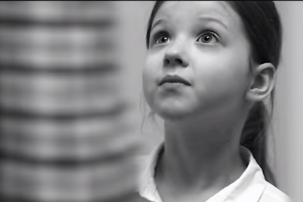 The ending of the advertisement shows a young girl entering a bathroom stall. A male hiding in a neighboring stall follows the girl in and slams the door behind him.