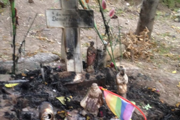 A memorial placed at the spot in a Santiago park where a group of self-described neo-Nazis fatally attacked Daniel Zamudio in 2012 was damaged by fire last week. (Photo courtesy of Patricio Angel)