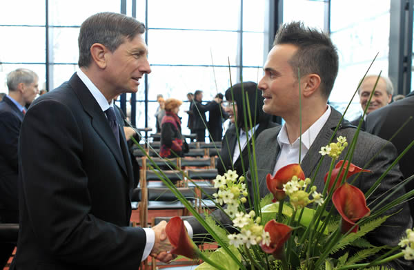 Jure Poglajen, right, greets Slovenian President Borut Pahor, in Ljubljana, Slovenia, on Jan. 4, 2016. Delo, the country’s most popular newspaper, honored Poglajen as one of its person of the year for 2015 for his work with refugees on the Greek island of Lesbos. (Photo courtesy of Jure Poglajen)