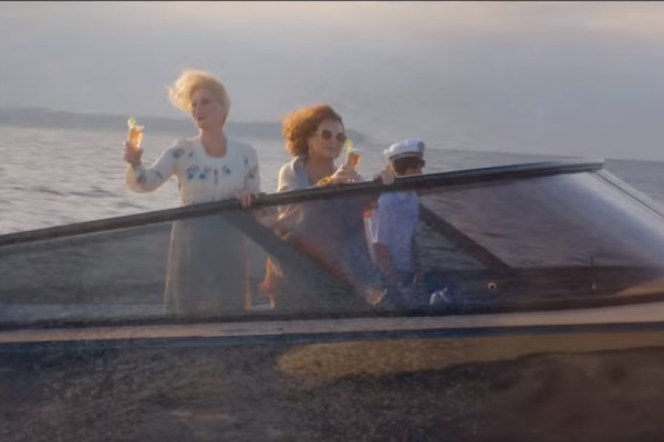 The trailer shows best friends Patsy and Edina living it up on the French Riviera with their much younger male companions. The friends hold cocktails while riding on a motorboat, walk on the beach and beckon their young male companions to join them in a toast in the preview clips.