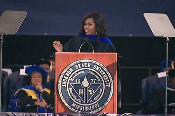 First Lady Michelle Obama gives the commencement speech at Jackson State University in Jackson, Miss. on Saturday, April 23, 2016. (Screen capture via livestream)