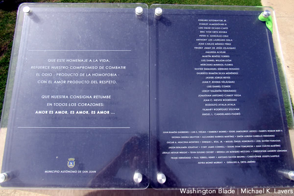 A plaque with the names of the 49 victims of the Pulse nightclub massacre is located in San Juan’s Third Millennium Park. It is adjacent to the U.S. commonwealth’s first LGBT-specific monument that San Juan Mayor Carmen Yulín Cruz officially dedicated on June 26.