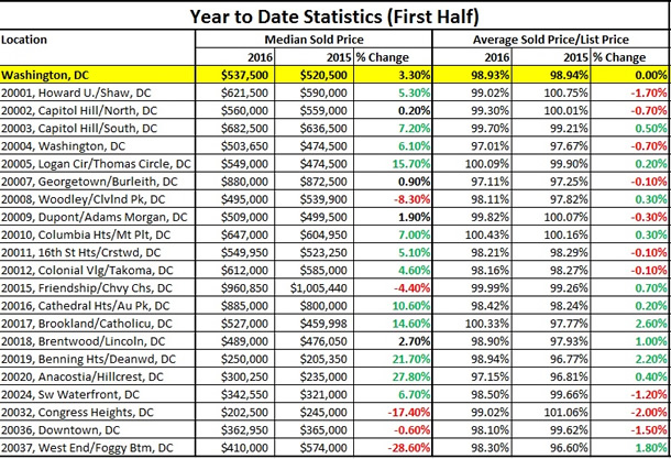 First, let’s note that D.C. median sold prices rose 3.30 percent in the first half of 2016 vs. the same period last year. The median sold price for a home in D.C. is now $537,000. The ratio of average sold price to original list price did not increase in D.C.— homes are still selling for 98.93 percent of their original list price, which means there still aren’t many bargains out there for buyers.