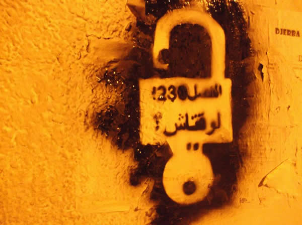 A sign spray-painted onto a wall asks Tunisian lawmakers when they will repeal Article 230 of their country’s penal code that criminalizes consensual same-sex sexual relations. Those who have been arrested and charged under the law have undergone so-called anal tests to determine whether they are gay. (Photo submitted)