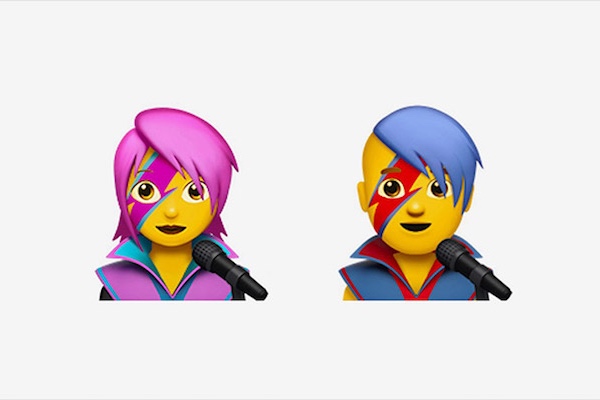 The Bowie-inspired emojis are featured in both a female and male singer with lightning bolt makeup resembling Bowie’s 1973 “Aladdin Sane” album cover. The emojis also include little microphones.