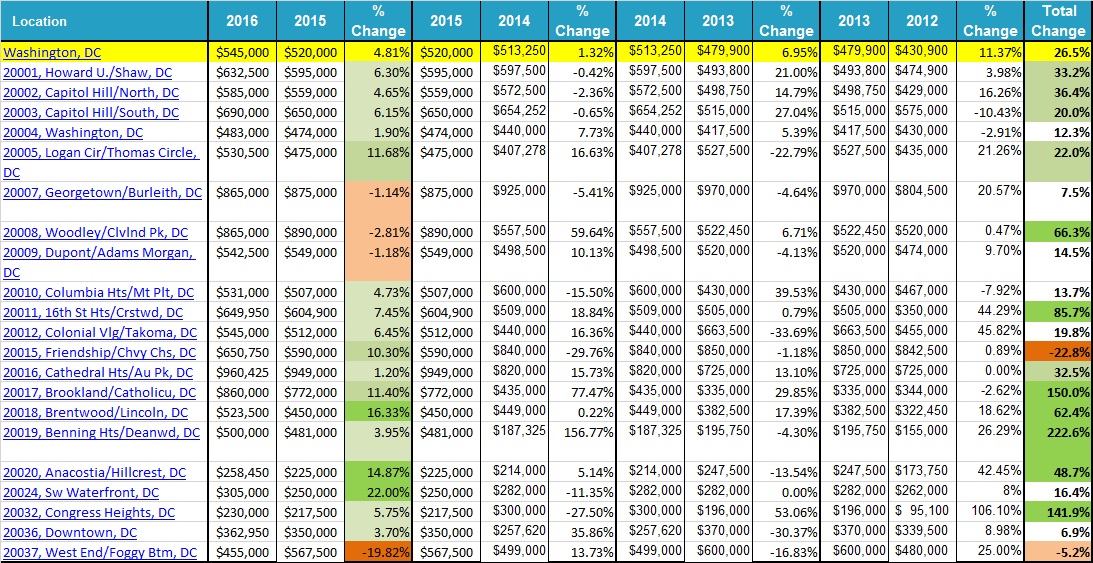 Zip code neighborhoods that actually saw a decline in median prices over 5 years are 20015 (Friendship Heights, Chevy Chase DC) and 20037 (West End, Foggy Bottom).