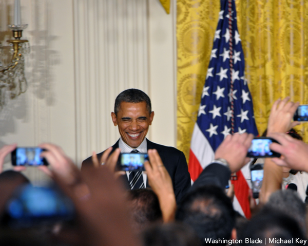 President Obama smiles for a sea of cell phone cameras during the White House Pride Reception. Obama hosted a June Pride reception each year of his presidency. (Washington Blade photo by Michael Key)