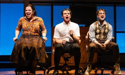 “Merrily We Roll Along” was originally conceived and created more than 40 years ago, a reunion of Sondheim with “Company” book-writer George Furth and director Harold Prince, based on a 1934 play by George Kaufman and Moss Hart. Telling the 20-year story of three college friends who grow apart and become estranged as their lives and their goals diverge, it wasn’t ever going to be a feel-good musical; what made it even more of a “downer” was that it told that story in reverse, beginning with the unhappy ending and then going backward in time, step by step, to the youthful idealism and deep bonds of camaraderie that they shared in their first meeting. On one hand, getting the “bad news” first keeps the ending from becoming a crushing disappointment; but on the other hand, the irony that results from knowing how things play out becomes more and more painful with each and every scene.