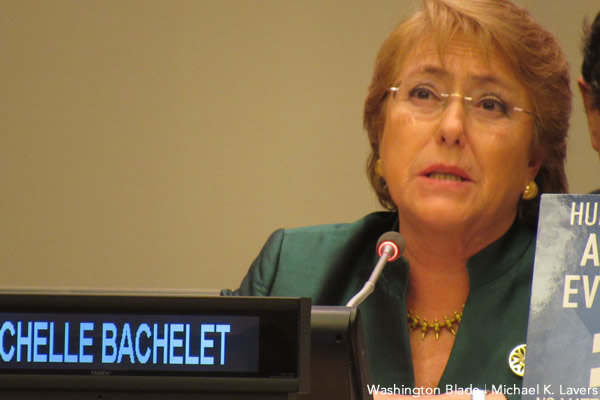 Chilean President Michelle Bachelet speaks at a United Nations LGBT Core Group event in New York on Sept. 21, 2016. Her government will introduce a same-sex marriage bill in the coming months. (Washington Blade photo by Michael K. Lavers)