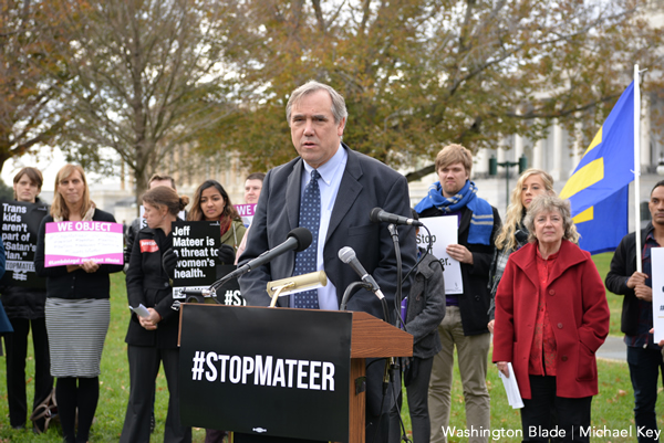 Sen. Jeff Merkley (D-Oregon) speaks at a rally outside of the U.S. Senate on Tuesday opposing the confirmation of Jeff Mateer to the federal bench. (Washington Blade photo by Michael Key)