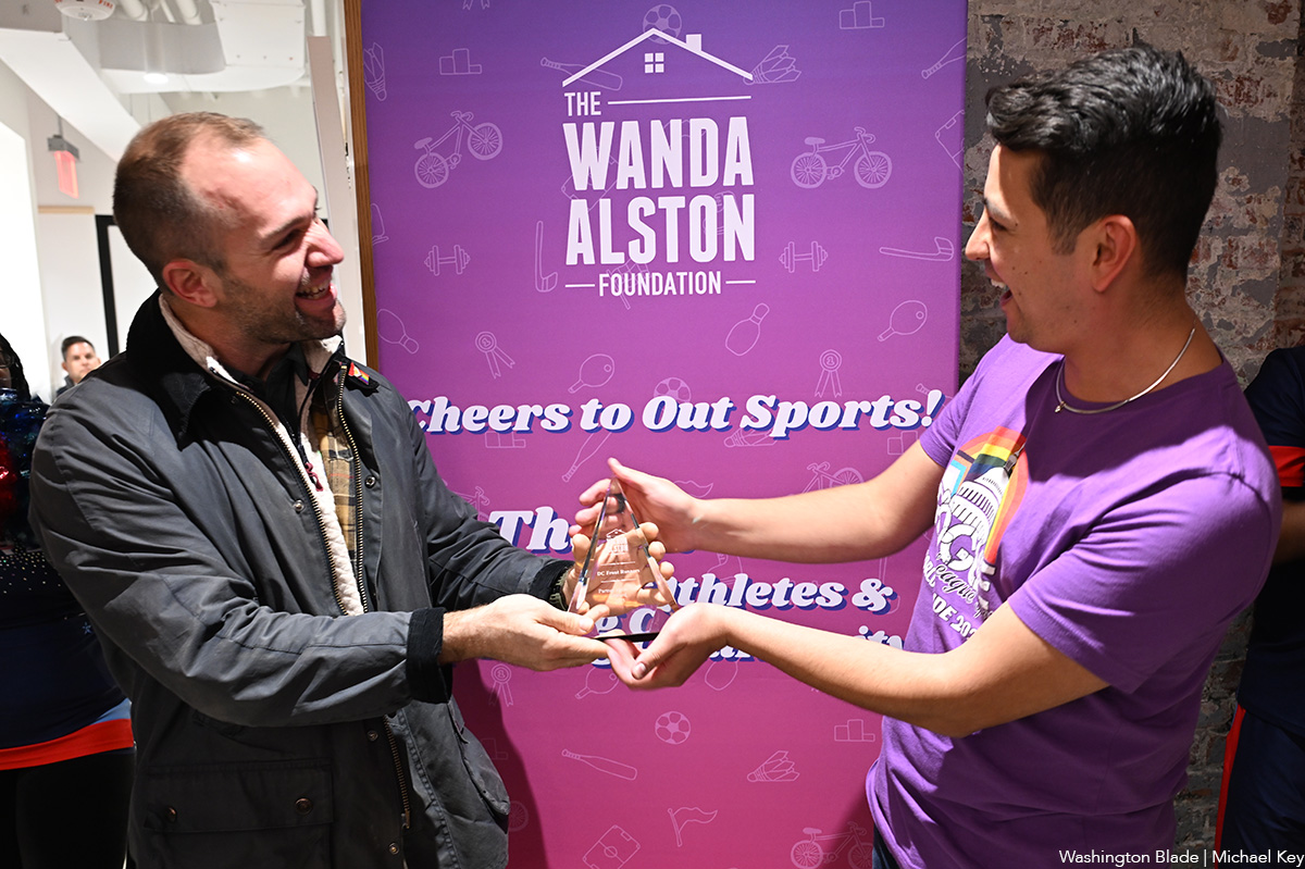 Wanda Alston Foundation Executive Director Cesar Toledo, on right, presents an award to the D.C. Front Runners at the 'Cheers to Out Sports!' event held at the DC LGBTQ+ Community Center on Monday. (Washington Blade photo by Michael Key)