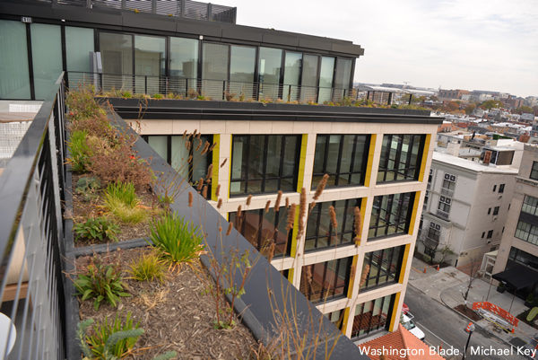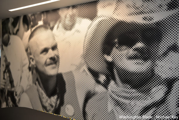 Moving from the lobby and into the redesigned work area, more than a few of the pixilated, black-and-white images stenciled into the walls were derived from the Washington Blade’s coverage over the years. They gave the new building a sense of living history while infusing it with art.